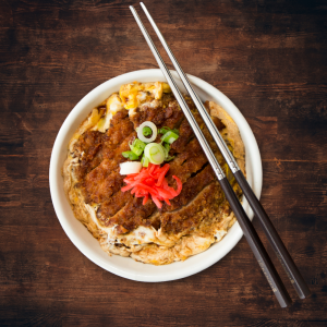 Pork cutlet & egg on rice w/ mushrooms, onion, unagi sauce, red ginger, scallion.